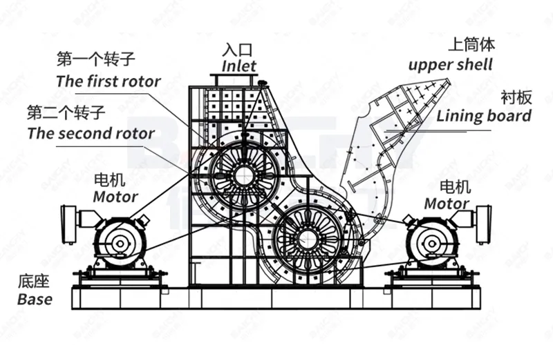 1. Двухступенчатое дробление, одноступенчатый процесс: Двухступенчатая дробилка имеет две независимые системы роторов. Материал сначала подвергается крупному дроблению в роторе первой ступени, а затем поступает в ротор второй ступени для мелкого дробления. Такая конструкция эквивалентна объединению дробилки крупного и мелкого помола в одну, что обеспечивает высокую степень измельчения и легкость обработки материалов сложного состава и различных размеров.