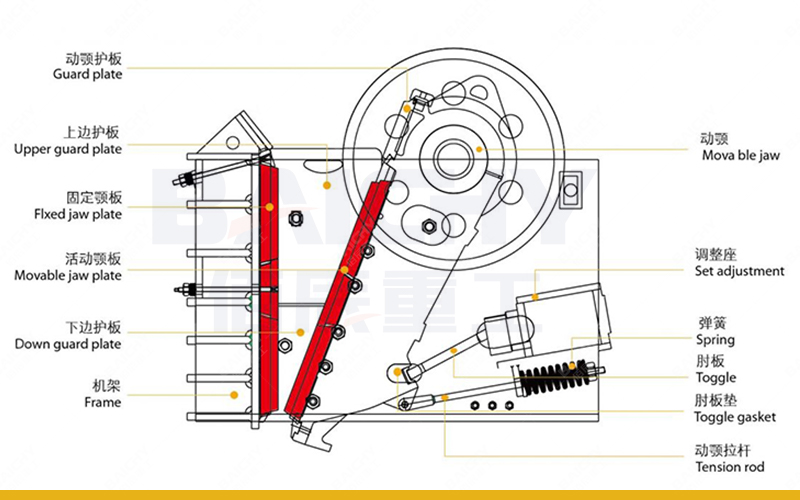 В щековой дробилке PE600x900 используется зигзагообразный метод экструзии. Двигатель приводит в движение ремень и шкив, которые периодически перемещают подвижную щековую пластину вверх и вниз для измельчения и выгрузки материала. Его внутренняя конструкция в основном состоит из неподвижной зажимной пластины, подвижной зажимной пластины, рамы, верхней и нижней защитных пластин, регулировочного гнезда, подвижной зажимной тяги и т.д.